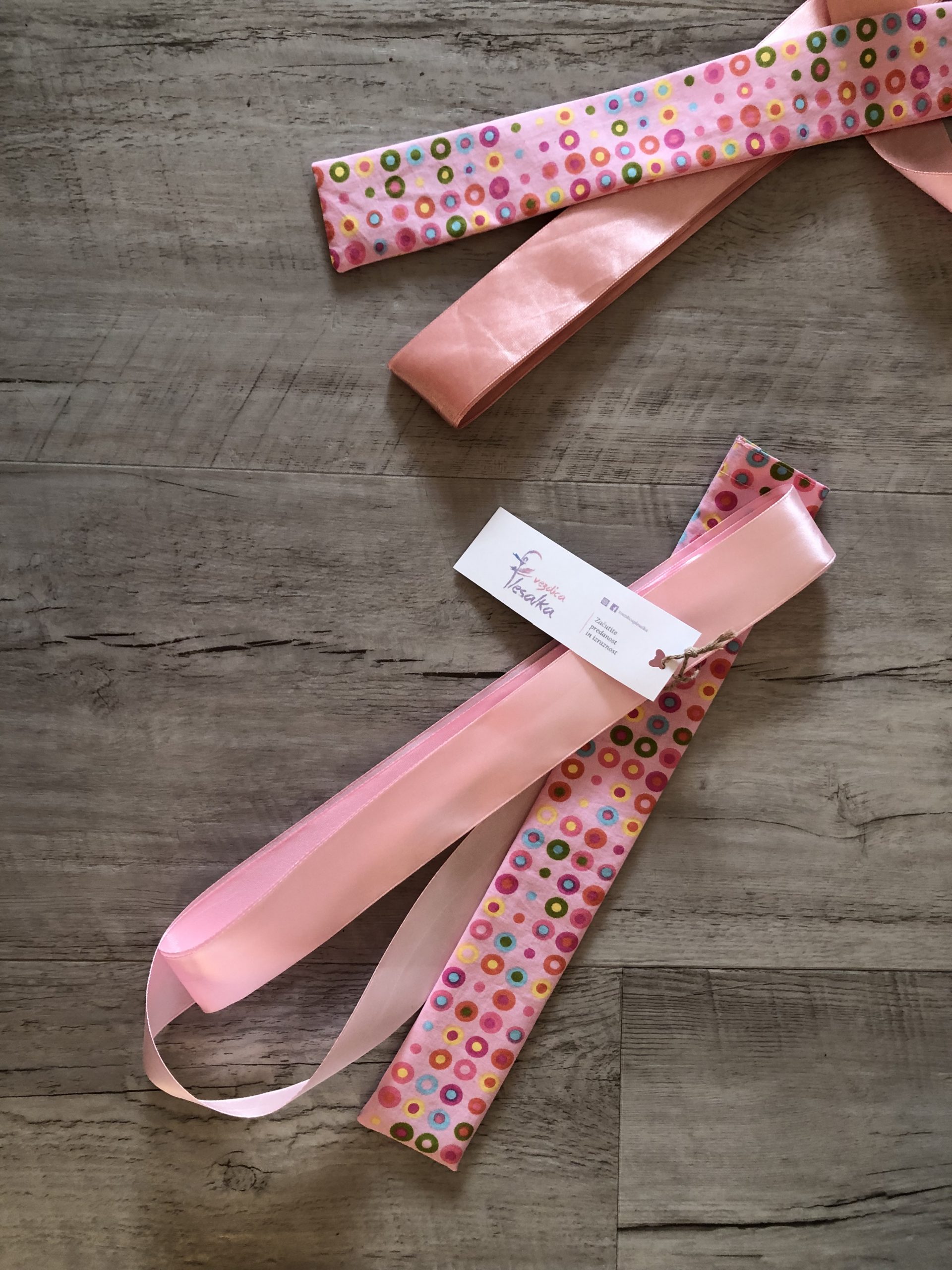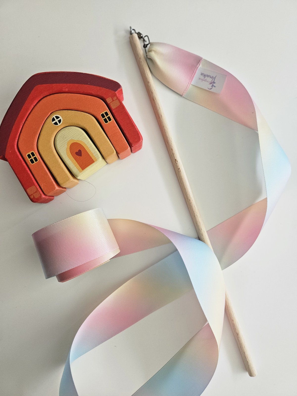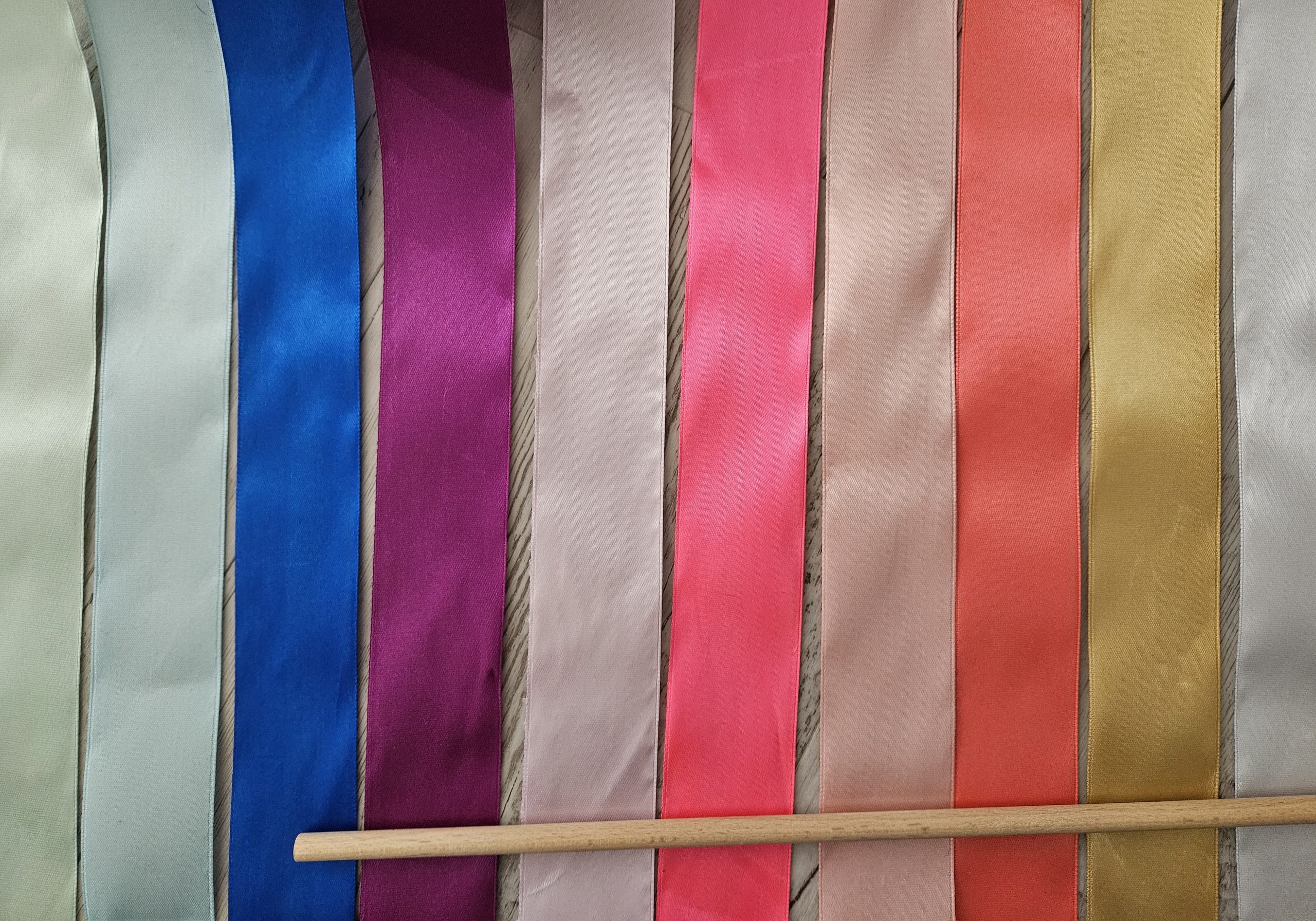 Gibalno-plesni trakec različnih barv je na lesenem vodilu pripravljen po naročilu.